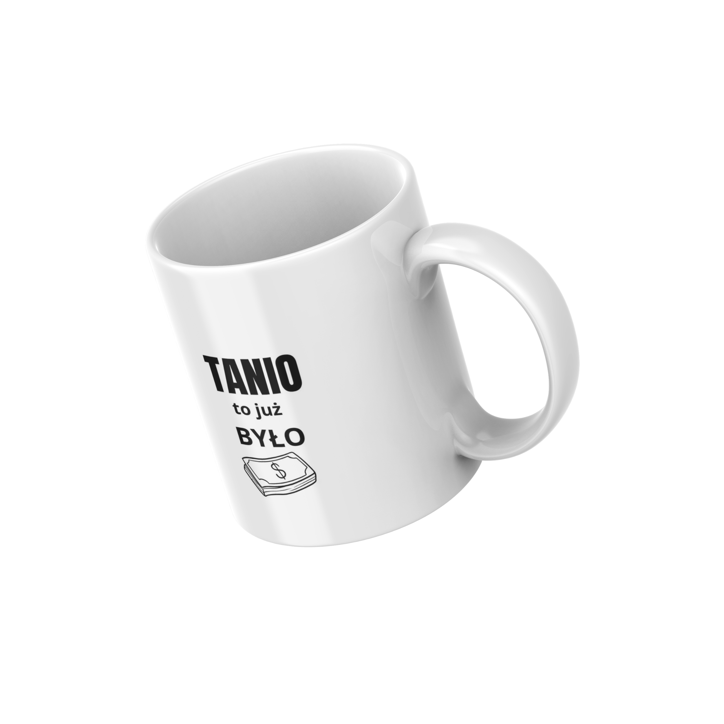 Oferujemy wysokiej jakości biały kubek ceramiczny z napisem” Tanio to już było”.