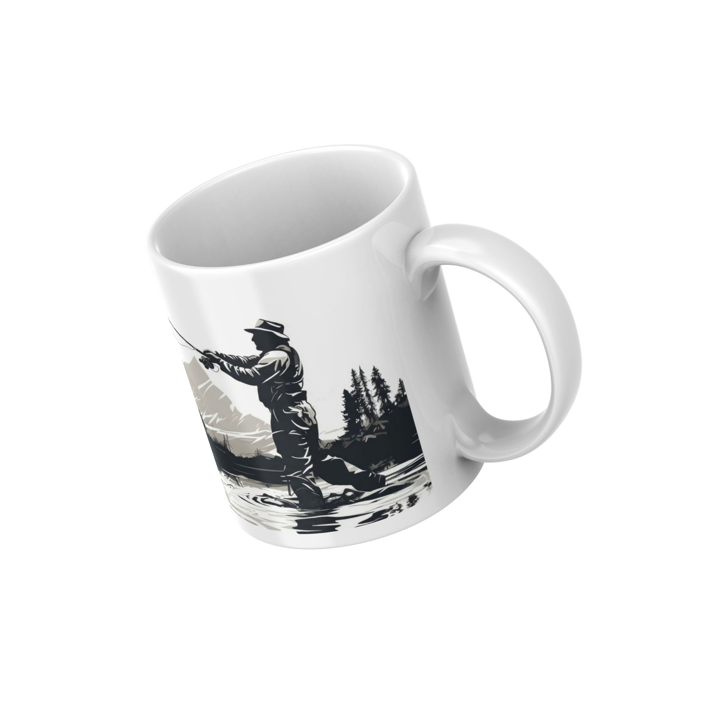 Oferujemy wysokiej jakości biały kubek ceramiczny przeznaczony do zapalonych wędkarzy z grafiką dookoła kubka.