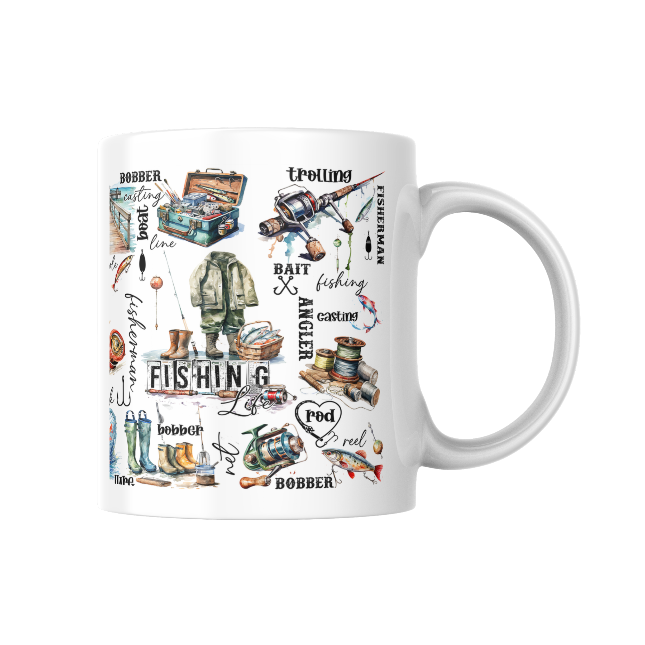 Oferujemy wysokiej jakości biały kubek ceramiczny przeznaczony do zapalonych wędkarzy z grafiką dookoła kubka.